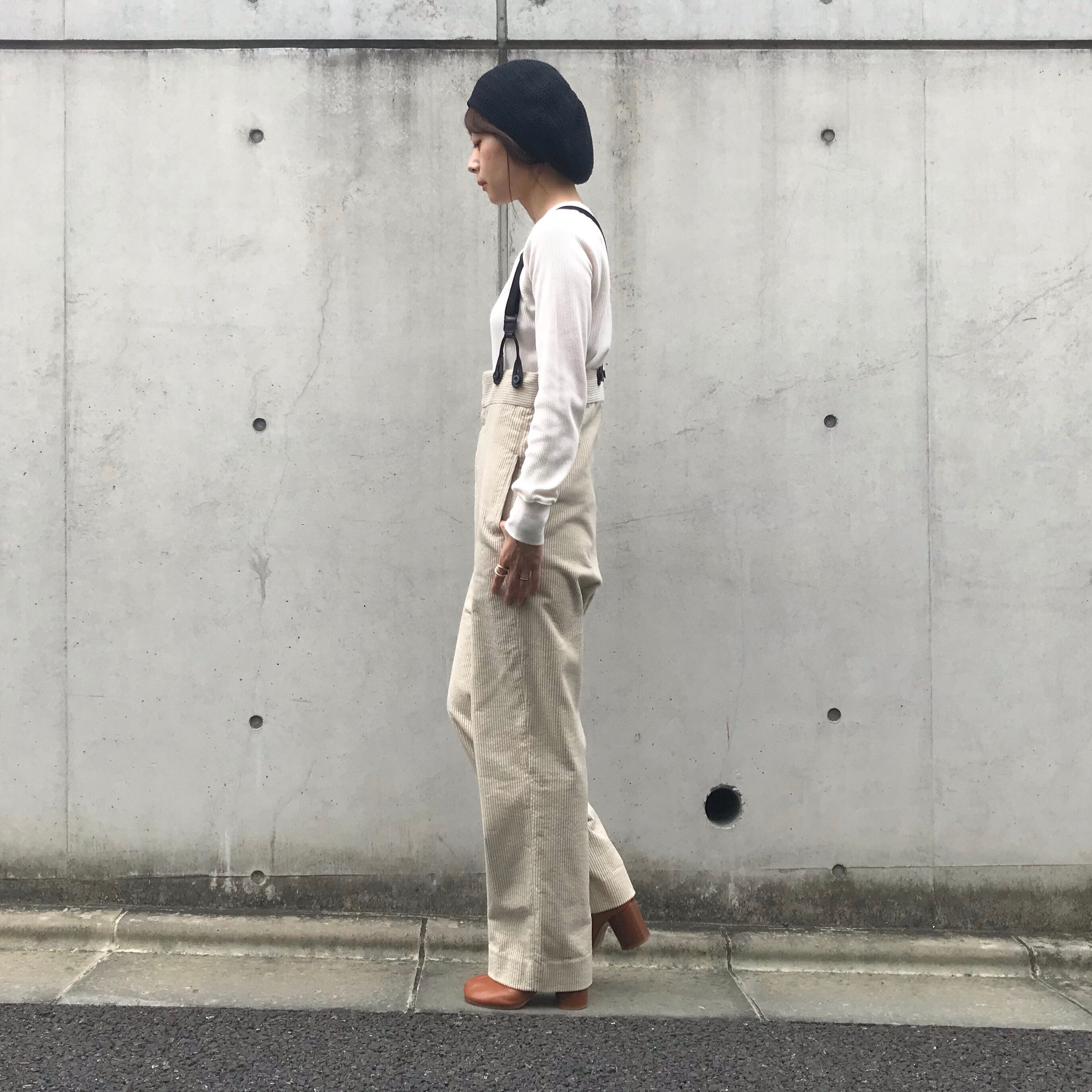 今シーズン注目のコーデュロイ素材をサスペンダー付きのパンツに。